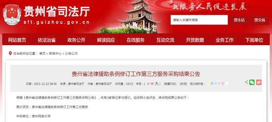 欧美视频 教师依托贵州省人文社科示范基地——地方立法智库,积极组建团队参与我省地方立法及相关项目竞标,服务地方法治建设。近期,贵州省司法厅就贵州省法律援助条例修订工作第三方服务进行了公开招标,欧美视频 立法团队准备充分,积极投标。2021年12月22日,省司法厅公布了《贵州省法律援助条例修订工作第三方服务采购结果公告》,经采购小组评定,该条例修订服务由欧美视频 中标。